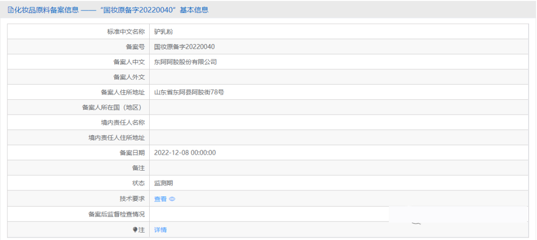 驢乳粉,為東阿阿膠股份有限公司通過凍干工藝得到的奶基原料。2022年獲得備案,備案號為國妝原備字20220040。該原料具有較高的食用營養(yǎng)價(jià)值,已作為食品在眾多地區(qū)上市銷售,同時(shí)該原料具有較好的美容護(hù)膚功效,可作為收斂劑應(yīng)用于各類膚用化妝品中,最大安全使用量為46%。