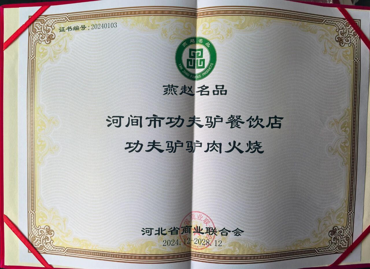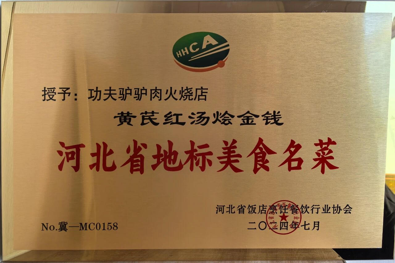 2024年,功夫驢驢肉火燒入選首批“河北省地標(biāo)美食”;“燕趙名品”;“滄州手信”。功夫驢全驢宴被評(píng)為河北地標(biāo)名宴,功夫驢黃芪紅湯燴金錢(qián)、功夫驢驢肉辣醬被評(píng)為河北地標(biāo)名菜。