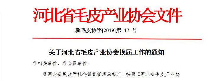 關(guān)于河北省毛皮產(chǎn)業(yè)協(xié)會(huì)換屆工作的通知 各相關(guān)單位、各會(huì)員單位: 經(jīng)河北省民政廳社會(huì)組織管理局批準(zhǔn),按照《河北省毛皮產(chǎn)業(yè)協(xié)會(huì)章程》有關(guān)規(guī)定,我會(huì)擬于201
