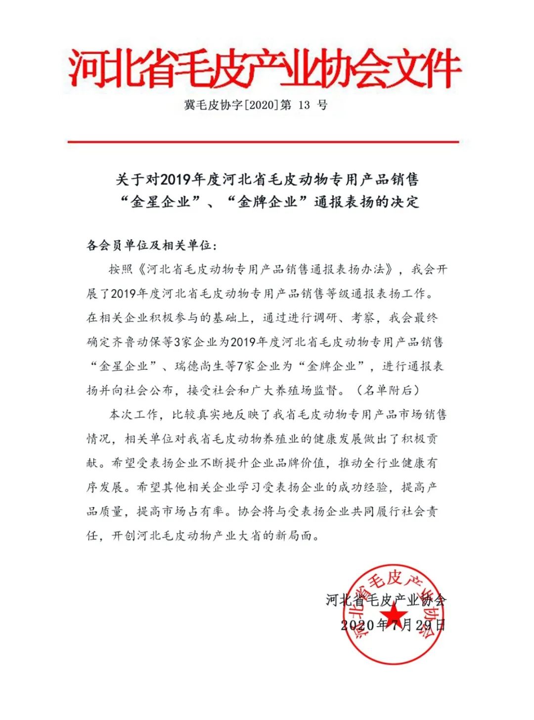 2019年度河北省毛皮動(dòng)物專用產(chǎn)品銷售“金牌企業(yè)”名單