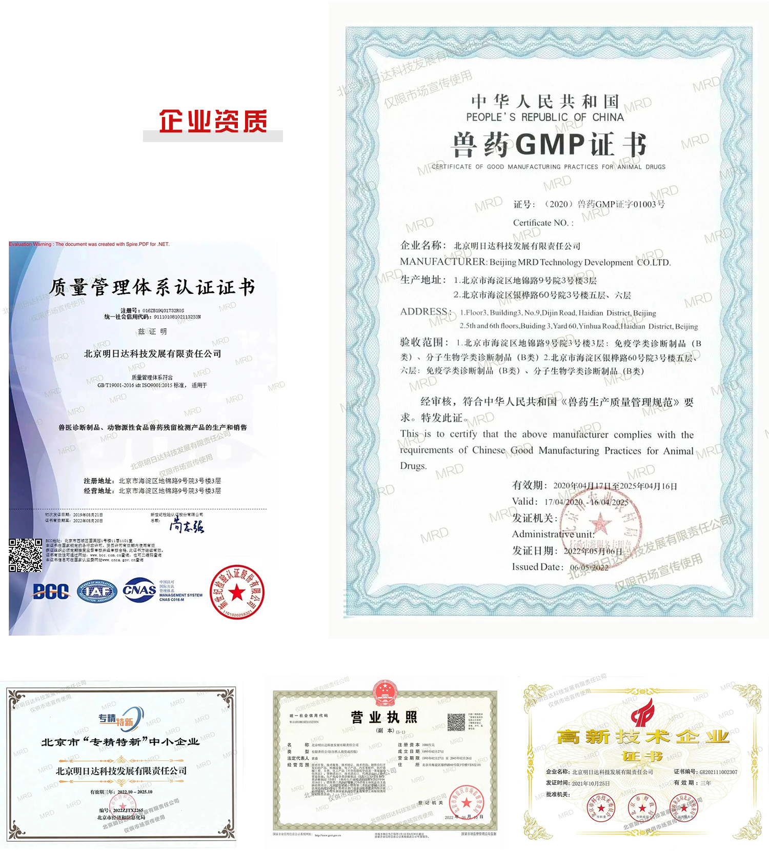 明日達(dá)科技致力于為動(dòng)物養(yǎng)殖和屠宰加工行業(yè)提供全面的檢測(cè)解決方案。公司建有免疫學(xué)類(lèi)診斷制品(B類(lèi))生產(chǎn)線、分子生物學(xué)類(lèi)診斷制品(B類(lèi))生產(chǎn)線各一條,并已通過(guò)獸醫(yī)診斷制品GMP驗(yàn)收,企業(yè)已通過(guò) ISO9001:2015 質(zhì)量管理體系認(rèn)證,有國(guó)家新獸藥證書(shū)產(chǎn)品2項(xiàng),農(nóng)業(yè)農(nóng)村部獸藥產(chǎn)品批準(zhǔn)文號(hào)3項(xiàng)。