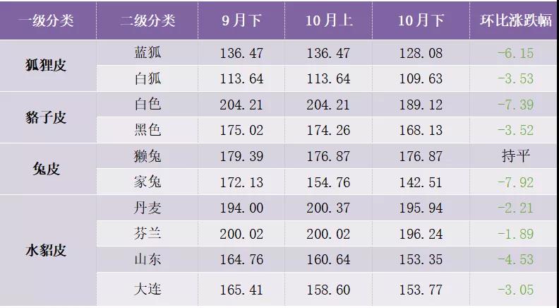 10月下半月,裘皮產(chǎn)品價(jià)格指數(shù)繼續(xù)保持穩(wěn)中有降
