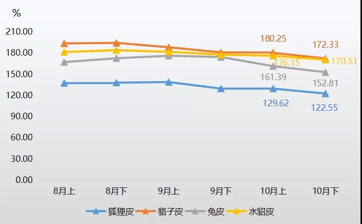 裘皮各品類產(chǎn)品價(jià)格指數(shù)中,狐貍皮和兔皮產(chǎn)品價(jià)格指數(shù)下跌幅度較大,10月下半月價(jià)格指數(shù)分別收?qǐng)?bào)122.55點(diǎn)和152.81點(diǎn),環(huán)比跌幅分別為5.45%和5.32%,其中兔皮價(jià)格下跌是裘皮產(chǎn)品價(jià)格指數(shù)下滑的主要原因,導(dǎo)致裘皮產(chǎn)品價(jià)格指數(shù)下滑2.57個(gè)百分點(diǎn)。貉子皮和水貂皮產(chǎn)品價(jià)格10月下半月價(jià)格指數(shù)分別收?qǐng)?bào)172.33點(diǎn)和170.51點(diǎn),環(huán)比分別下滑4.39%和3.20%。