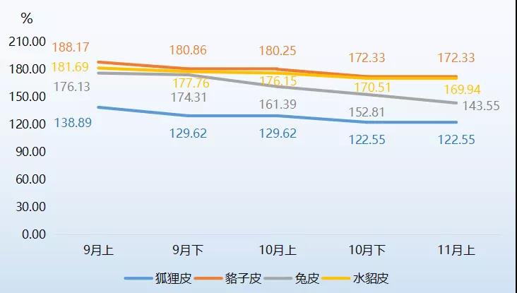 裘皮各品類產(chǎn)品價格指數(shù)中,兔皮和水貂皮產(chǎn)品價格指數(shù)均有所下滑,其中兔皮產(chǎn)品價格指數(shù)下跌幅度較大,11月上半月收報143.55點,環(huán)比跌幅為6.06%,是裘皮產(chǎn)品價格指數(shù)下滑的主要原因,導致裘皮產(chǎn)品價格指數(shù)下滑2.78個百分點。水貂皮產(chǎn)品價格指數(shù)11月上半月小幅下滑收報169.94點,跌幅為0.33%,環(huán)比跌幅有所收窄。狐貍皮和貉子皮產(chǎn)品價格指數(shù)運行穩(wěn)定,11月上半月分別收報122.55點和172.33點,與上期持平,其中值得注意的是,貉子皮產(chǎn)品價格指數(shù)近期首次出現(xiàn)止跌態(tài)勢,表明市場行情出現(xiàn)好轉(zhuǎn)跡象。