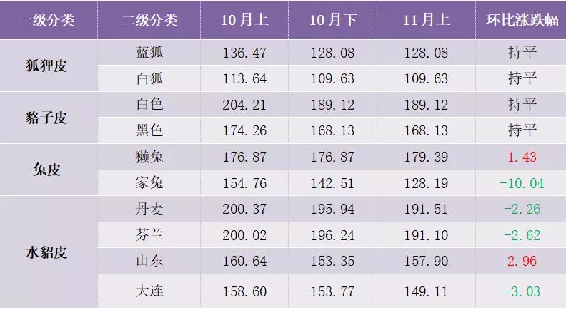 11月上半月,裘皮產(chǎn)品價格總指數(shù)呈現(xiàn)穩(wěn)中有降態(tài)勢