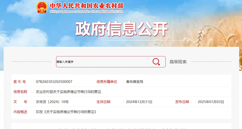 農(nóng)業(yè)農(nóng)村部關(guān)于實(shí)施養(yǎng)殖業(yè)節(jié)糧行動(dòng)的意見 2025年1月3日,農(nóng)業(yè)農(nóng)村部發(fā)布《農(nóng)業(yè)農(nóng)村部關(guān)于實(shí)施養(yǎng)殖業(yè)節(jié)糧行動(dòng)的意見》,全文如下。 各省、自治區(qū)、直轄市及計(jì)劃單列市