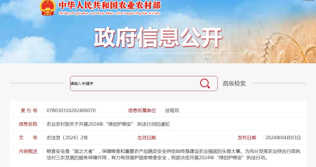 農(nóng)業(yè)農(nóng)村部關(guān)于開(kāi)展2024年“綠劍護(hù)糧安” 執(zhí)法行動(dòng)的通知