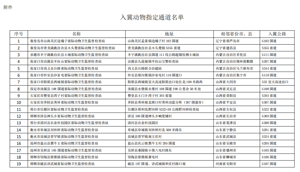 河北省人民政府關(guān)于入冀動(dòng)物實(shí)施指定通道管理的通告
