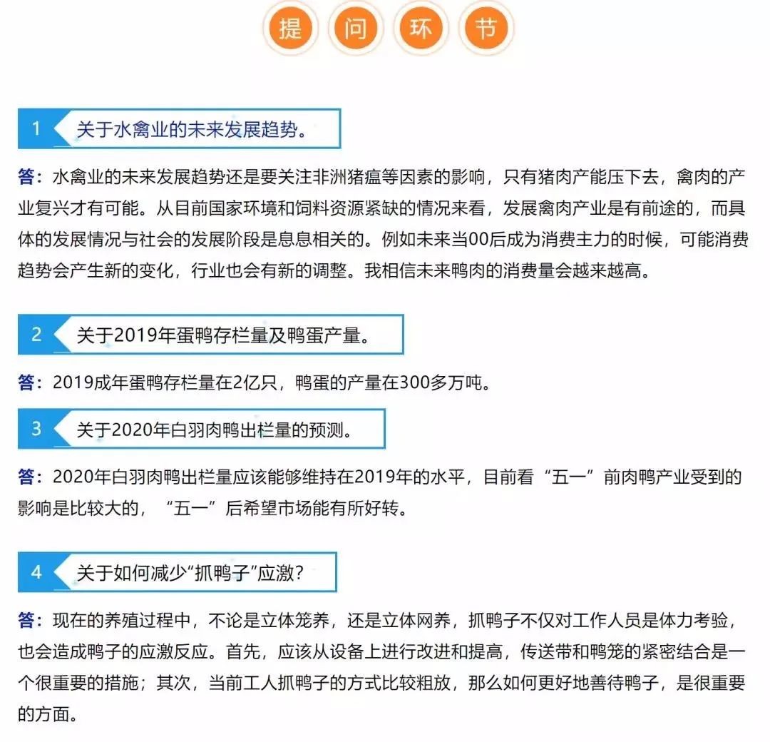 答:目前來看,豬肉短期內(nèi)很難恢復(fù),其市場份額恢復(fù)到63%比較困難,在此期間,鴨肉就能發(fā)揮替代作用。在未來,如何能把2019年肉鴨的市場占有率增長繼續(xù)保持下去,需要思考。強(qiáng)調(diào)一點,我們所有的養(yǎng)殖企業(yè),都應(yīng)該思考把養(yǎng)殖企業(yè)變成食品加工企業(yè),提高附加值。