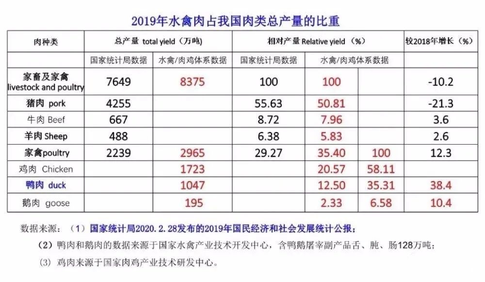 2019年,受非洲豬瘟疫情影響,全年豬肉產(chǎn)量下降21.3%,而禽肉產(chǎn)業(yè)得到較大發(fā)展,產(chǎn)量增長12.3%,其中2019年鴨肉產(chǎn)量較2018年增長38.4%,鵝肉產(chǎn)量增10.4%(數(shù)據(jù)來源于國家水禽產(chǎn)業(yè)技術(shù)體系)。