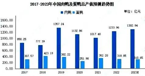 2020年-2021年,受新冠疫情、全球經(jīng)濟發(fā)展的不確定性以及豬肉供應(yīng)持續(xù)恢復(fù)的影響,我國肉鴨及蛋鴨總產(chǎn)值呈波動趨勢。我國肉鴨產(chǎn)值由2017年的850.25億元增長至2021年的1017.4億元,蛋鴨產(chǎn)值由2017年的307.57億元增長至2021年的352.2億元。預(yù)計2023年我國肉鴨及蛋鴨總產(chǎn)值分別達1302.94億元、310.65億元。