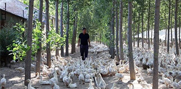 盛夏炎炎,萬物生長。近日,在河北省衡水市棗強縣王均鄉(xiāng)東故縣村的永盛養(yǎng)殖場內(nèi),記者看到上萬只大鵝穿梭林間,引頸高歌,好不熱鬧。鵝群中有個忙碌的身影正在給大鵝投喂飼料,他就