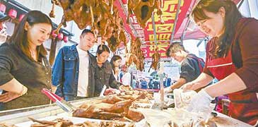 4月24日,榮昌區(qū)夏布小鎮(zhèn),榮昌鹵鵝的人氣爆棚,眾多游客前來購買。記者 鄭宇 攝/視覺重慶 5月4日,四川游客李利拎著兩盒“榮昌鹵鵝”,準(zhǔn)備坐高鐵回家。她的手機(jī)里