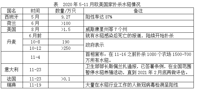 自2020年4月份,西班牙首先報(bào)道水貂集中感染新冠病毒和撲殺事件以來,荷蘭等歐美其他國(guó)家也陸續(xù)開始報(bào)道,同時(shí)也報(bào)道了水貂感染人,導(dǎo)致人大量發(fā)生新冠病毒的事件。截至2020年11月底,世界衛(wèi)生組織宣布7個(gè)國(guó)家水貂集中感染事件,并撲殺水貂。歐美國(guó)家撲殺水貂情況見表。