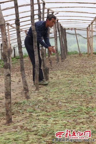 老楊在大棚里小心翼翼地怕踩到蝗蟲
