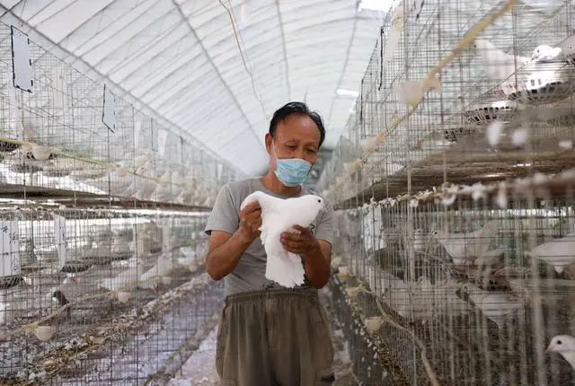 ↑6月18日,在廣宗縣核桃園鎮(zhèn)柏城村,飼養(yǎng)人員在查看肉鴿生長(zhǎng)情況。