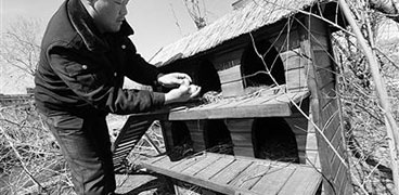 9月22日,硤州鄉(xiāng)太和村殘疾村民楊宏生(左)在養(yǎng)殖場(chǎng)抓起一只喂養(yǎng)3年的黑天鵝,向該市殘聯(lián)工作人員介紹現(xiàn)在已有20多斤重。楊宏生自幼殘疾,2011年在市殘聯(lián)的關(guān)心和幫助下學(xué)習(xí)養(yǎng)