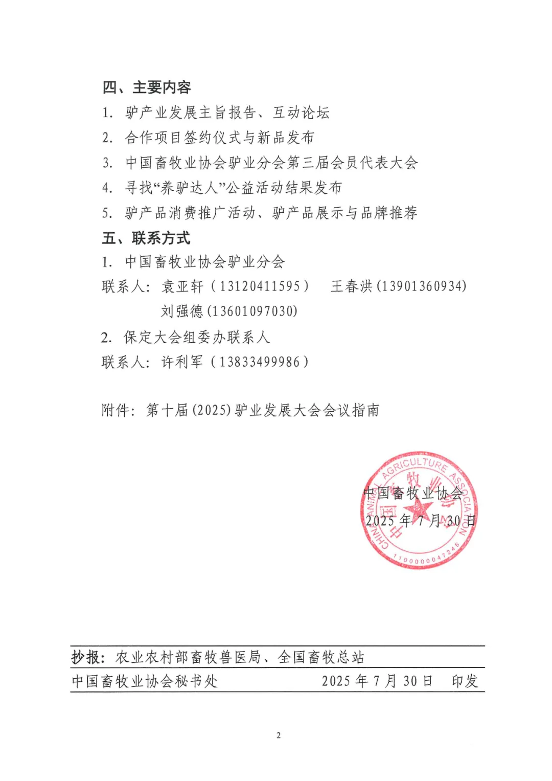 為深入貫徹落實農(nóng)業(yè)農(nóng)村部《關(guān)于促進(jìn)特色畜牧業(yè)高質(zhì)量發(fā)展的指導(dǎo)意見》及鄉(xiāng)村振興戰(zhàn)略部署,積極應(yīng)對當(dāng)前驢產(chǎn)業(yè)面臨的存欄量下行、供需失衡、養(yǎng)殖成本攀升、科技瓶頸等現(xiàn)實挑戰(zhàn),著力推動一二三產(chǎn)融合,激發(fā)消費市場活力,提升驢產(chǎn)業(yè)經(jīng)濟(jì)效益和社會效益,同時,加強行業(yè)同仁經(jīng)驗交流與洽談合作,中國畜牧業(yè)協(xié)會定于2025年9月27-29日(27日報到),在河北省保定市舉辦第十屆(2025)驢業(yè)發(fā)展大會。本屆大會以"創(chuàng)新賦能興驢業(yè),消費引領(lǐng)新發(fā)展"為主題,誠邀全國驢業(yè)及相關(guān)領(lǐng)域(涵蓋養(yǎng)殖、屠宰、加工、貿(mào)易、餐飲、投資、獸藥、生物制品、飼料、牧草、設(shè)備、數(shù)智化服務(wù)等)的企業(yè)家、專家學(xué)者、行業(yè)管理者等積極參會?,F(xiàn)將會議有關(guān)事項通知如下: