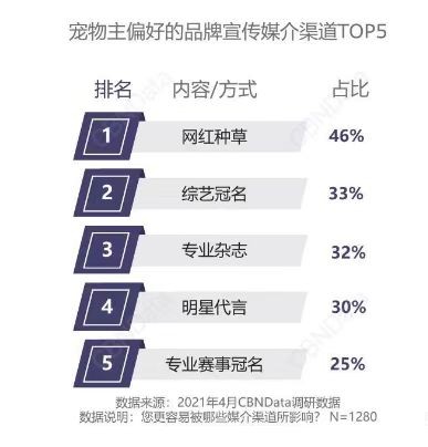 流量時代,寵物品牌選擇與明星代言合作的方式也盡顯多元,既有直接擔(dān)任代言人的“硬廣”模式,也有“種草”、擔(dān)任“體驗官”等“軟廣”模式。據(jù)第一財經(jīng)商業(yè)數(shù)據(jù)中心發(fā)布的《2021寵物食品行業(yè)消費(fèi)洞察報告》顯示,“種草”及直接的明星代言都是寵物主較為偏好的品牌宣傳媒介渠道。