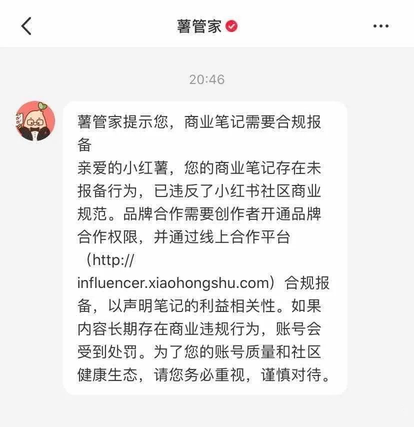 (小紅書平臺對未報備用戶的通知,截圖來自網(wǎng)絡(luò))