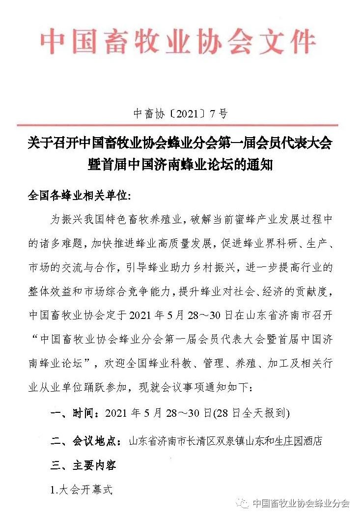 為振興我國(guó)特色畜牧養(yǎng)殖業(yè),破解當(dāng)前蜜蜂產(chǎn)業(yè)發(fā)展過程中的諸多難題,加快推進(jìn)蜂業(yè)高質(zhì)量發(fā)展,促進(jìn)蜂業(yè)界科研、生產(chǎn)、市場(chǎng)的交流與合作,引導(dǎo)蜂業(yè)助力鄉(xiāng)村振興,進(jìn)一步提高行業(yè)的整體效益和市場(chǎng)綜合競(jìng)爭(zhēng)能力,提升蜂業(yè)對(duì)社會(huì)、經(jīng)濟(jì)的貢獻(xiàn)度,中國(guó)畜牧業(yè)協(xié)會(huì)定于2021年5月28~30日在山東省濟(jì)南市長(zhǎng)清區(qū)雙泉鎮(zhèn)山東和生莊園酒召開“中國(guó)畜牧業(yè)協(xié)會(huì)蜂業(yè)分會(huì)第一屆會(huì)員代表大會(huì)暨首屆中國(guó)濟(jì)南蜂業(yè)論壇”,歡迎全國(guó)蜂業(yè)科教、管理、養(yǎng)殖、加工及相關(guān)行業(yè)從業(yè)單位踴躍參加。