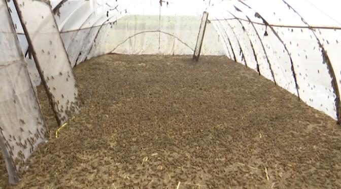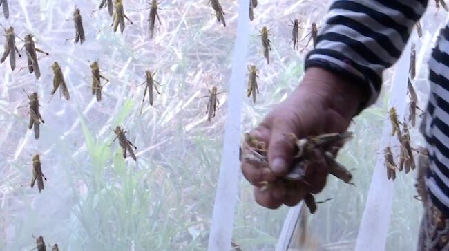 據(jù)了解,李松的一個養(yǎng)殖大棚,可養(yǎng)殖4萬余只螞蚱,25個大棚年產(chǎn)量能達7噸左右。