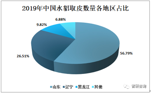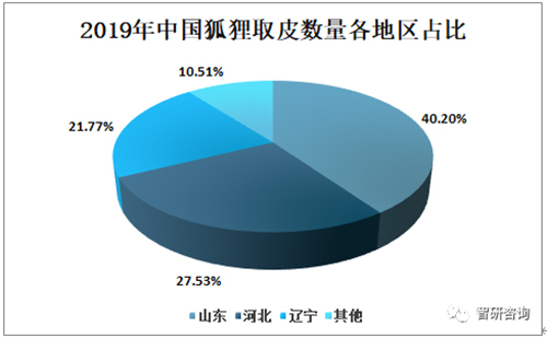 山東、遼寧、黑龍江地區(qū)為中國水貂、狐貍、貉子取皮的主要地區(qū),2019年山東水貂取皮數(shù)量占全國水貂取皮數(shù)量的56.79%;遼寧及黑龍江水貂取皮數(shù)量占全國水貂取皮數(shù)量的比重分別為26.51%、9.82%。