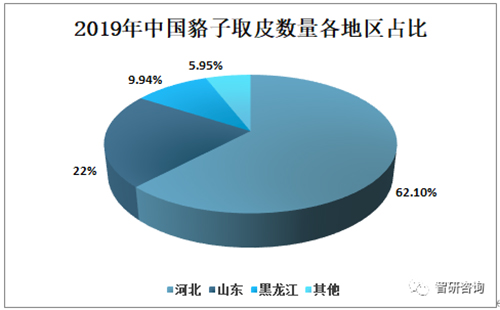 2019年河北貉子取皮數(shù)量占全國貉子取皮數(shù)量的62.10%,山東及黑龍江貉子取皮數(shù)量占全國貉子取皮數(shù)量的比重分別為22%、9.94%。