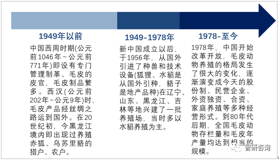 新中國成立以后,于1956年,從國外引進(jìn)了種獸和技術(shù)設(shè)備(狐貍、水貂是從國外引種,貉子是地產(chǎn)品種)在遼寧、山東、黑龍江、吉林等地興建了一批養(yǎng)殖場,當(dāng)時多以水貂養(yǎng)殖為主。1978年,中國開始改革開放,毛皮動物養(yǎng)殖的格局發(fā)生了很大的變化,逐漸演變成今天的股份制、民營企業(yè)、外資獨(dú)資、合資、家庭養(yǎng)殖等多種經(jīng)營形式。到80年代后期,全國毛皮動物存欄量和毛皮年產(chǎn)量均達(dá)到相當(dāng)?shù)囊?guī)模。養(yǎng)殖形式在原有的農(nóng)村庭院式養(yǎng)殖的基礎(chǔ)上,銜生出了場區(qū)式養(yǎng)殖與統(tǒng)一規(guī)劃小區(qū)式養(yǎng)殖,養(yǎng)殖品種上開始出現(xiàn)區(qū)域化、多樣化,與之相關(guān)的飼料、獸藥、機(jī)械、加工等行業(yè)也發(fā)展了起來,毛皮動物產(chǎn)業(yè)鏈已成雛形。