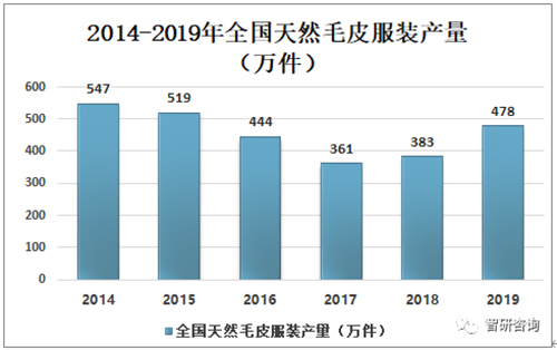 中國毛皮工業(yè)經(jīng)過多年的發(fā)展和積累,現(xiàn)在已經(jīng)成為世界最大的毛皮生產(chǎn)國和出口國,在國際裘皮市場上處于十分重要的地位。但自2013年年底開始,在國內(nèi)外各種因素影響下,中國毛皮動物行業(yè)整體陷入低迷,中國毛皮動物養(yǎng)殖進(jìn)入“拐點(diǎn)”調(diào)整期。2014-2017年中國天然毛皮服裝產(chǎn)量呈下降走勢,隨后出現(xiàn)回升趨勢;2017年中國天然毛皮服裝產(chǎn)量為2014-2019年最低值,2017年中國天然毛皮服裝產(chǎn)量僅為361萬件;2019年中國天然毛皮服裝產(chǎn)量為478萬件,較2018年增加95萬件。