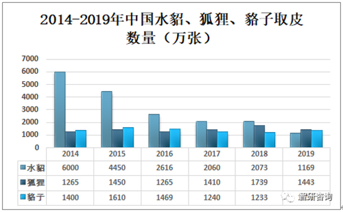 通常應(yīng)用的毛皮有羊、兔、狗等,比較名貴的有狐貍、貉子、水貂毛皮等,常用做大衣、帽子、圍巾的材料,比較厚重的毛皮如熊、狼的毛皮一般作為褥子、掛毯等材料。2019年中國水貂、狐貍、貉子取皮數(shù)量分別為1169萬張、1443萬張、1359萬張。