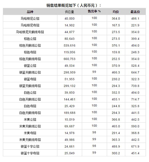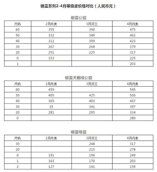 為期7天的丹麥四月線上拍賣(mài)會(huì)結(jié)束了,水貂皮的售出量近280萬(wàn)張,整體價(jià)格全面上漲,上漲幅度請(qǐng)對(duì)比2-4月份價(jià)格。