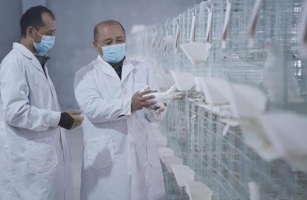 在巴音郭楞蒙古自治州和靜縣額勒再特烏魯鄉(xiāng)察汗烏蘇村肉鴿養(yǎng)殖繁育基地,工作人員在觀察鴿子的生長情況
