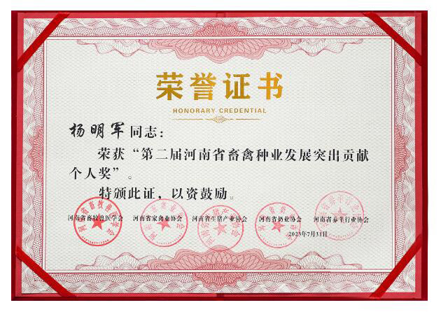 天成鴿業(yè)董事長(zhǎng)楊明軍榮獲“河南省畜禽種業(yè)發(fā)展突出貢獻(xiàn)個(gè)人獎(jiǎng)”