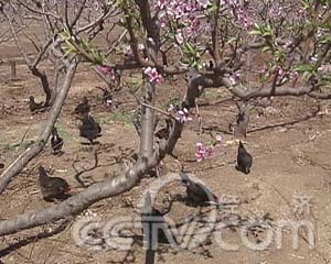 記者:在這兒每天 按照規(guī)定的時間這些黑雞放到桃園里讓它們增加活動量增強體質(zhì) 你想想啊 在這桃園里這些黑雞抓著蟲 吃著草 跟我們逛桃園 賞桃花是一樣一樣的。