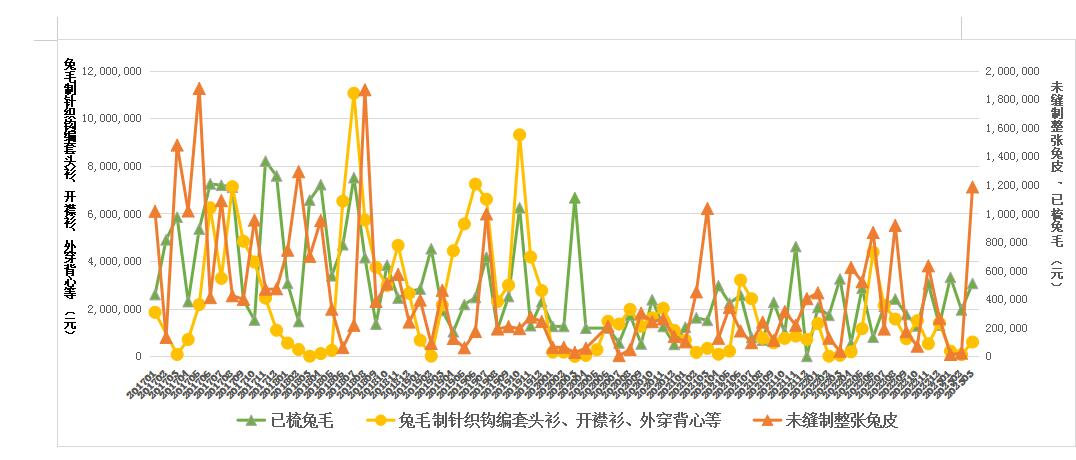 因2023年的兔產(chǎn)品進出口數(shù)據(jù)更新到3月份,4月度報告更新了3月度報告中的分析。2023年3月份,出口的兔產(chǎn)品主要有家兔及野兔、其他家兔及野兔(改良種用除外)、鮮/冷/凍家兔或野兔肉及食用雜碎兔肉、凍兔肉(不包括兔頭)、未縫制整張兔皮、已梳兔毛、兔毛制針織鉤編套頭衫、開襟衫、外穿背心等;進口的兔產(chǎn)品主要是整張兔皮和兔毛制針織鉤編套頭衫、開襟衫、外穿背心等。