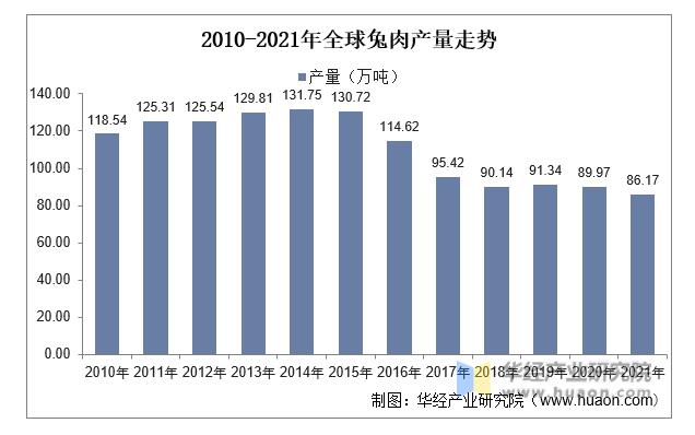 全球兔肉產(chǎn)量,目前全球整體兔肉產(chǎn)量自2015-2017年明顯下降后,整體產(chǎn)量較為穩(wěn)定,基本在90萬噸,主要受中國(guó)等主要產(chǎn)區(qū)產(chǎn)量下降影響,數(shù)據(jù)顯示,2014年全球兔肉產(chǎn)量達(dá)高點(diǎn)131.75萬噸,隨后波動(dòng)下降至2021年的86.17萬噸。