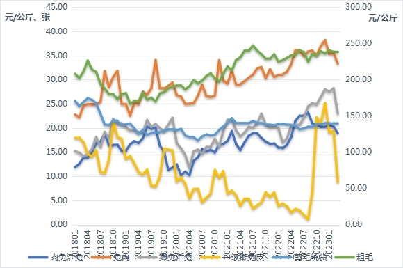 圖2 2018年5月-2023年6月兔及兔產(chǎn)品價(jià)格走勢(shì)(右坐標(biāo)為兔毛價(jià)格)