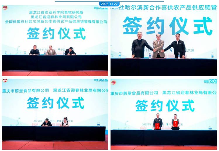 開幕式后舉行了簽約儀式。黑龍江省農(nóng)業(yè)科學院畜牧研究所、哈爾濱新合作喜供農(nóng)產(chǎn)品供應鏈管理有限公司與黑龍江省迎春林業(yè)局達成合作;重慶市鵝堂食品有限公司也與黑龍江省迎春林業(yè)局有限公司完成簽約,展現(xiàn)了強強聯(lián)合、深化產(chǎn)業(yè)協(xié)作的趨勢。