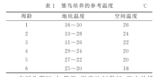 育雛鳥的保溫,雛鳥沒有皮下脂肪層來(lái)保溫,所以需要人工加溫,出殼后前兩月的保溫工作是育雛的關(guān)鍵,特別是出殼后前兩月的腹部溫度對(duì)雛鳥的成活尤為重要。雛鳥對(duì)溫度的變化極其敏感,溫度略低,雛鳥就會(huì)發(fā)出吱吱的叫聲,如溫度再下降,雛鳥就會(huì)擠堆,這時(shí)一些病小鳥就可能會(huì)發(fā)生踩踏致傷或窒息死亡。如溫度稍高鴕鳥就會(huì)張口呼吸并發(fā)出急速的叫聲。所以我們?cè)谟r過(guò)程中要根據(jù)雛鳥的活動(dòng)狀態(tài)來(lái)靈活控制溫度。前幾年育的供溫設(shè)施用紅外線燈、石棉板加熱器和電熱硅等,經(jīng)過(guò)許多飼養(yǎng)者的艱苦探索和總結(jié),現(xiàn)在我們主要以“地坑+溫棚”的模式進(jìn)行育靠,“地坑+溫棚”造價(jià)低廉、操作簡(jiǎn)便、受溫面積大而均勻且保濕效果好,通過(guò)我們實(shí)踐推廣已取得了理想的效果。另外,在保溫的同時(shí),還應(yīng)注意有效通風(fēng),以保證育雛舍空氣新鮮(見表1)。